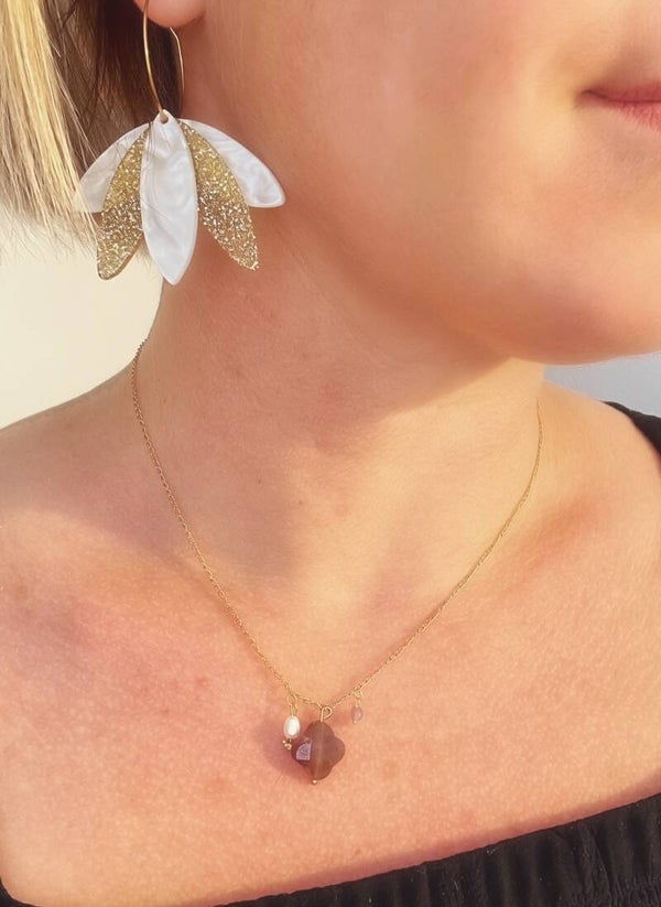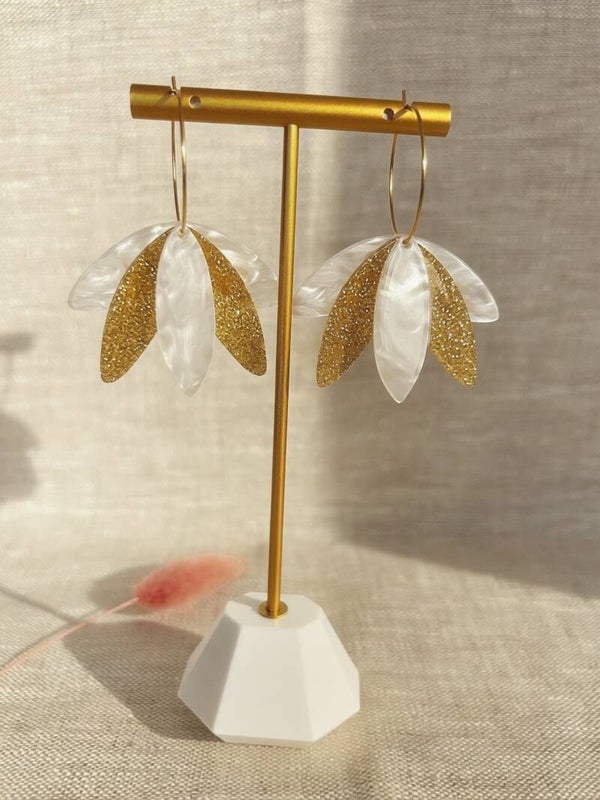 Pendentifs feuilles en acrylique pailletées dorées et blancs nacrées