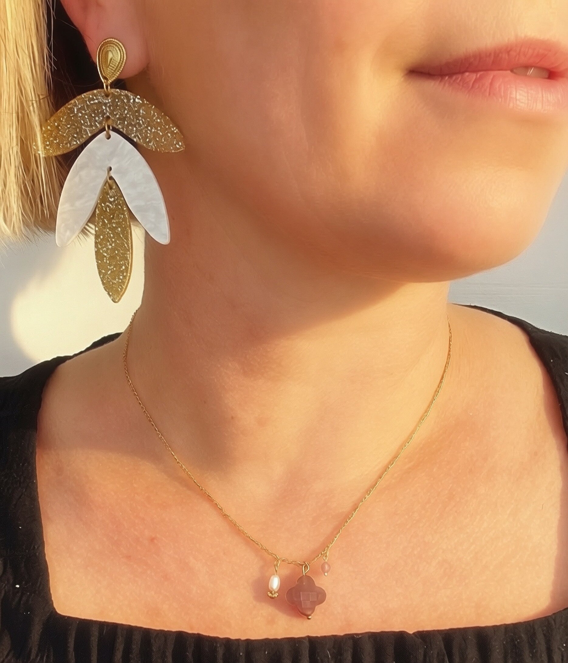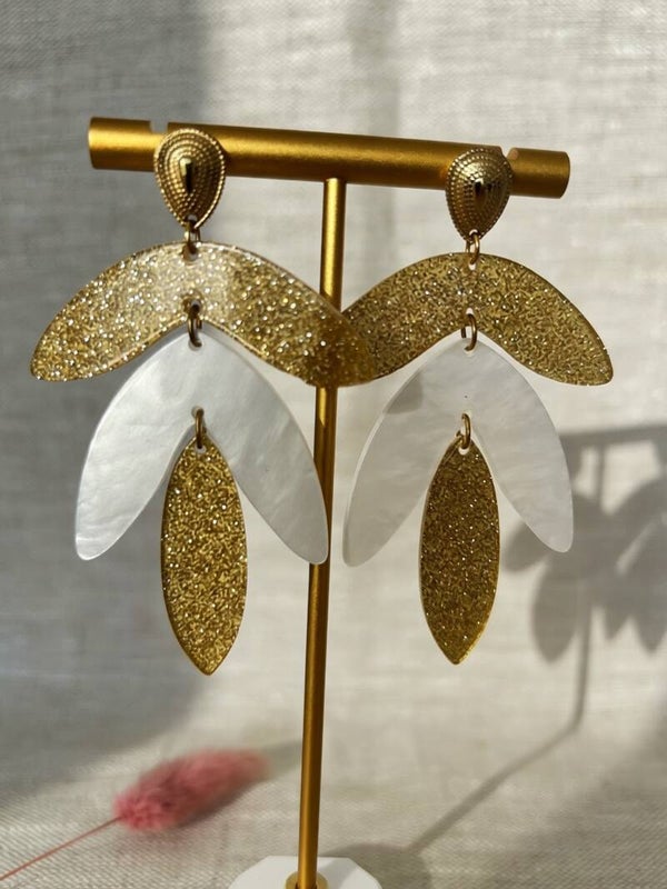 Pendentifs feuilles en acrylique pailleté doré et blanc nacré