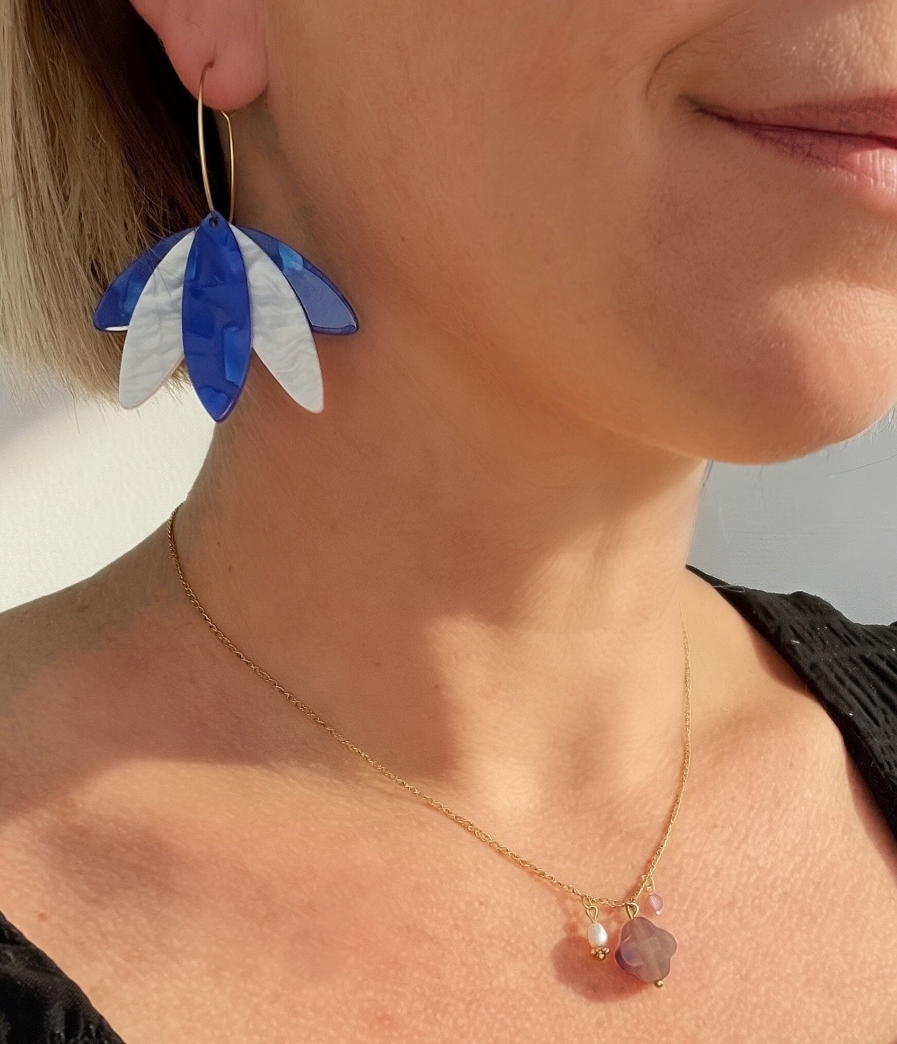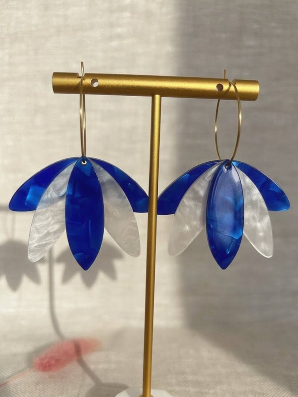 Pendentifs feuilles en acrylique bleu roi nacré et blanc nacré