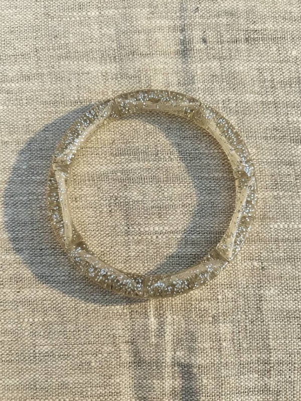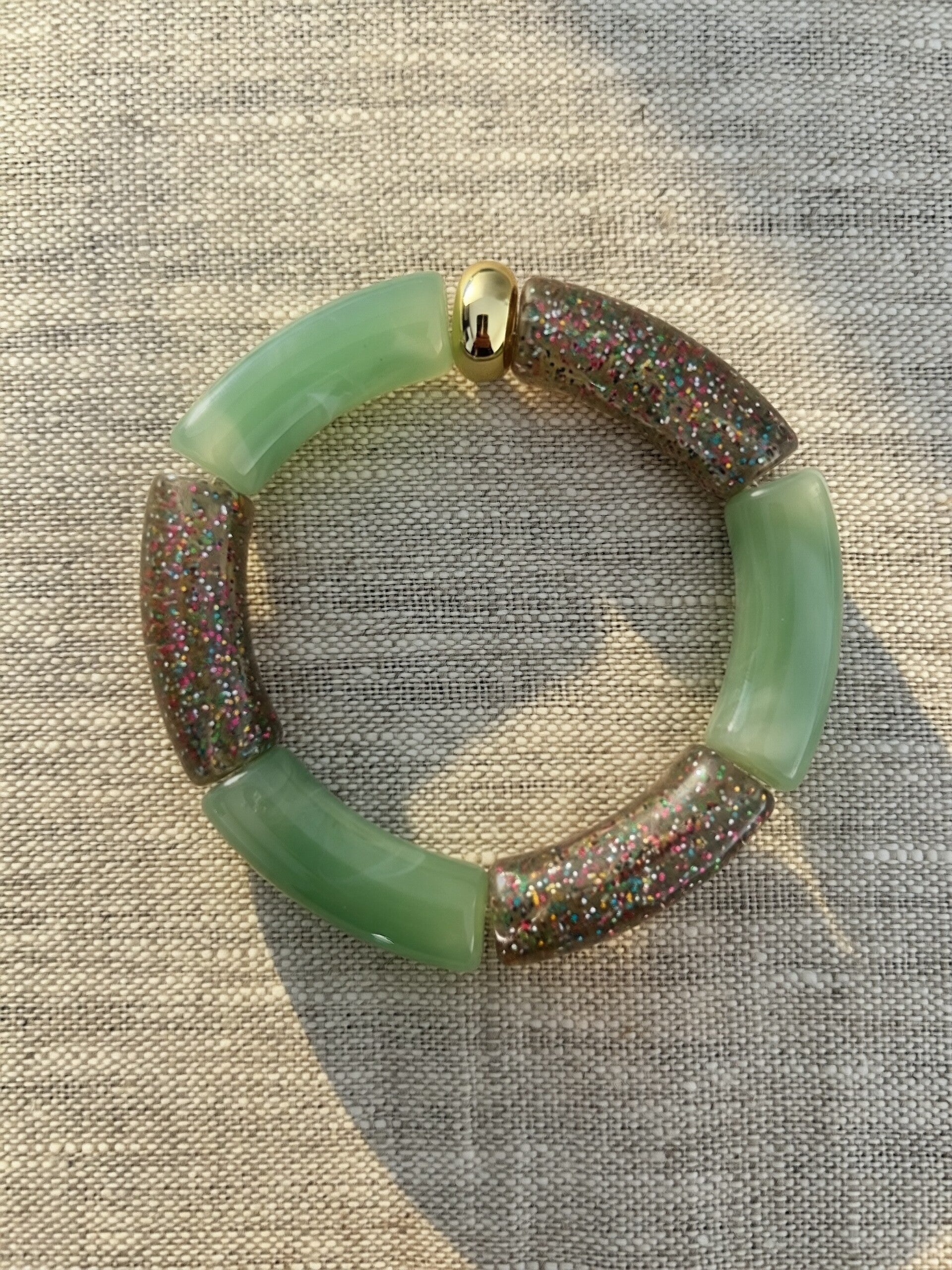 Bracelets RIO en tube acrylique de couleur : gris pailletée multicolore, marbré vert sauge et pailletée argentée. Perles rondelles en acrylique métallisées dorées.